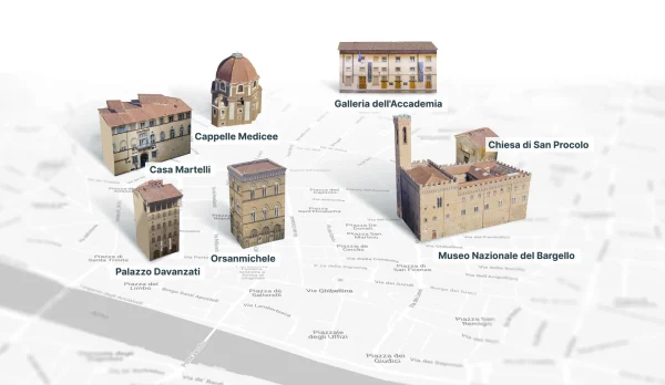 アカデミア美術館、バルジェッロ美術館、ダヴァンツァーティ宮殿、メディチ家礼拝堂、ミケランジェロの秘密の小部屋(メディチ家礼拝堂内)、オルサンミケーレ教会、カーザ・マルテッリ美術館